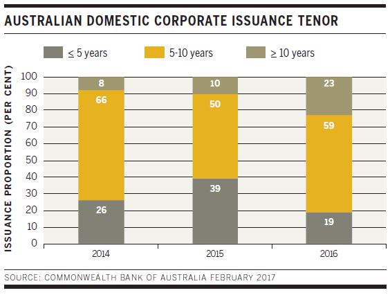 In the corporate market, AusNet Services Holdings got issuance up and running with a bang when it priced A$425 million of new 10-year bonds on 7 February. The deal is Australia’s largest 10-year true-corporate deal since the financial crisis and, market participants say, hints at the potential for Australia to start offering a consistent 10-year issuance option for corporates. The proportion of Australian dollar corporate issuance with long duration continued to pick up in 2016 (see chart), and further development of the long end is an important goal for credit-market participants.
