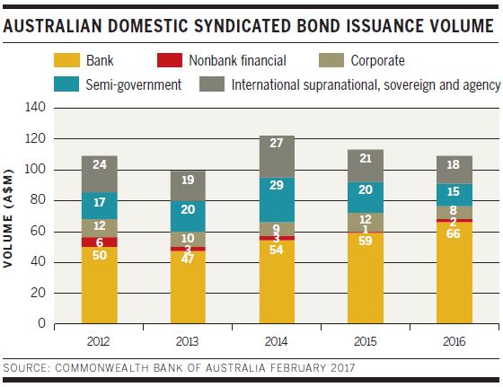 Australian domestic corporate bond issuance also had a slower year in 2016. The local credit market has become increasingly dominated by bank deals, which accounted for more than half of all volume in 2015 and nearly two-thirds of the total in 2016 (see chart).